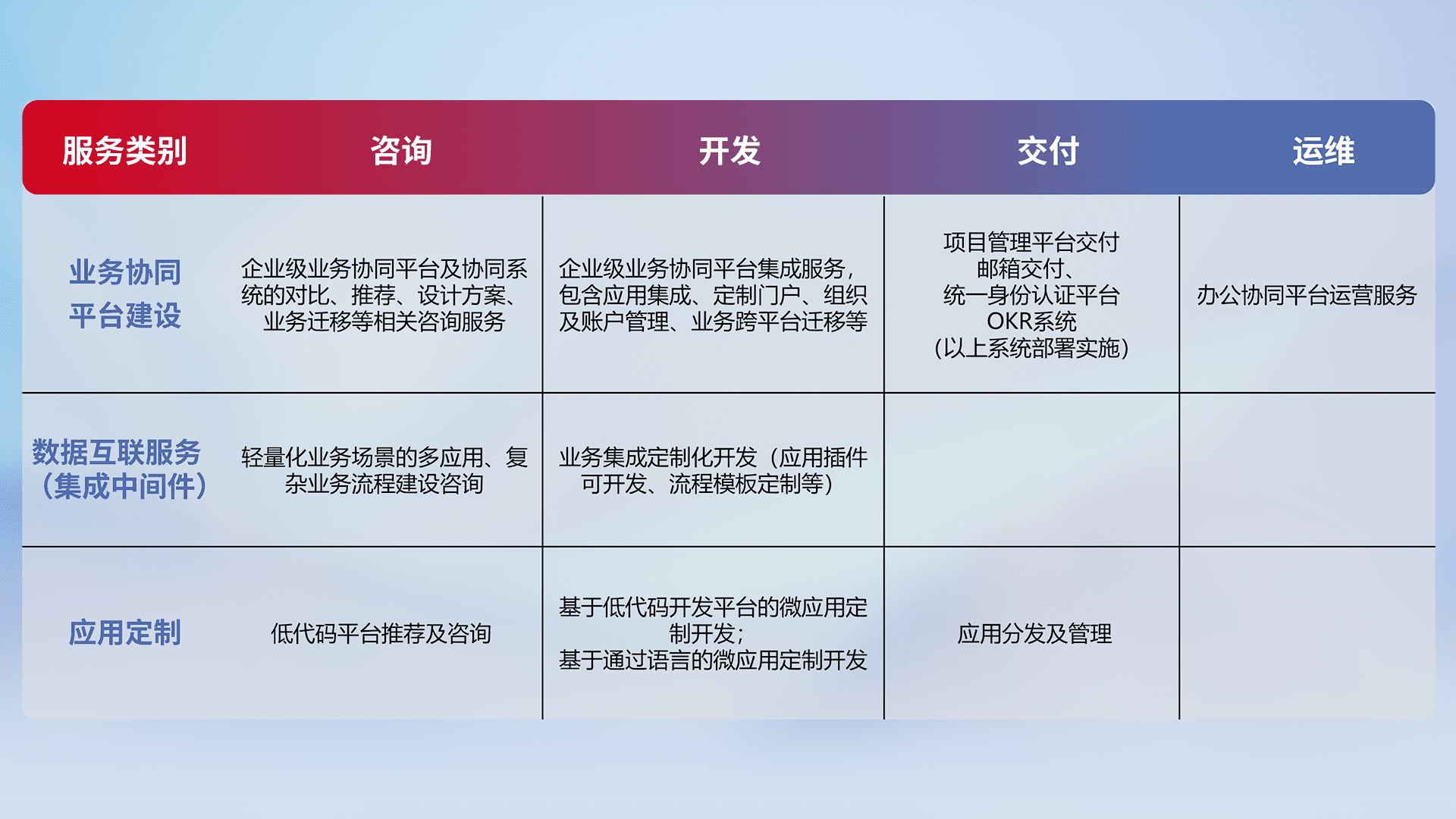 针对钉钉、、企微、、、IDaas等平台级产品提供产品的规划、、方案、、、、交付、、、、定制化开发等服务,,,,实现如统一协同办公、、、智能客户服务、、、、混合会议管理、、、、智能数据查询、、、、等业务场景,,,实现数字化转型。。