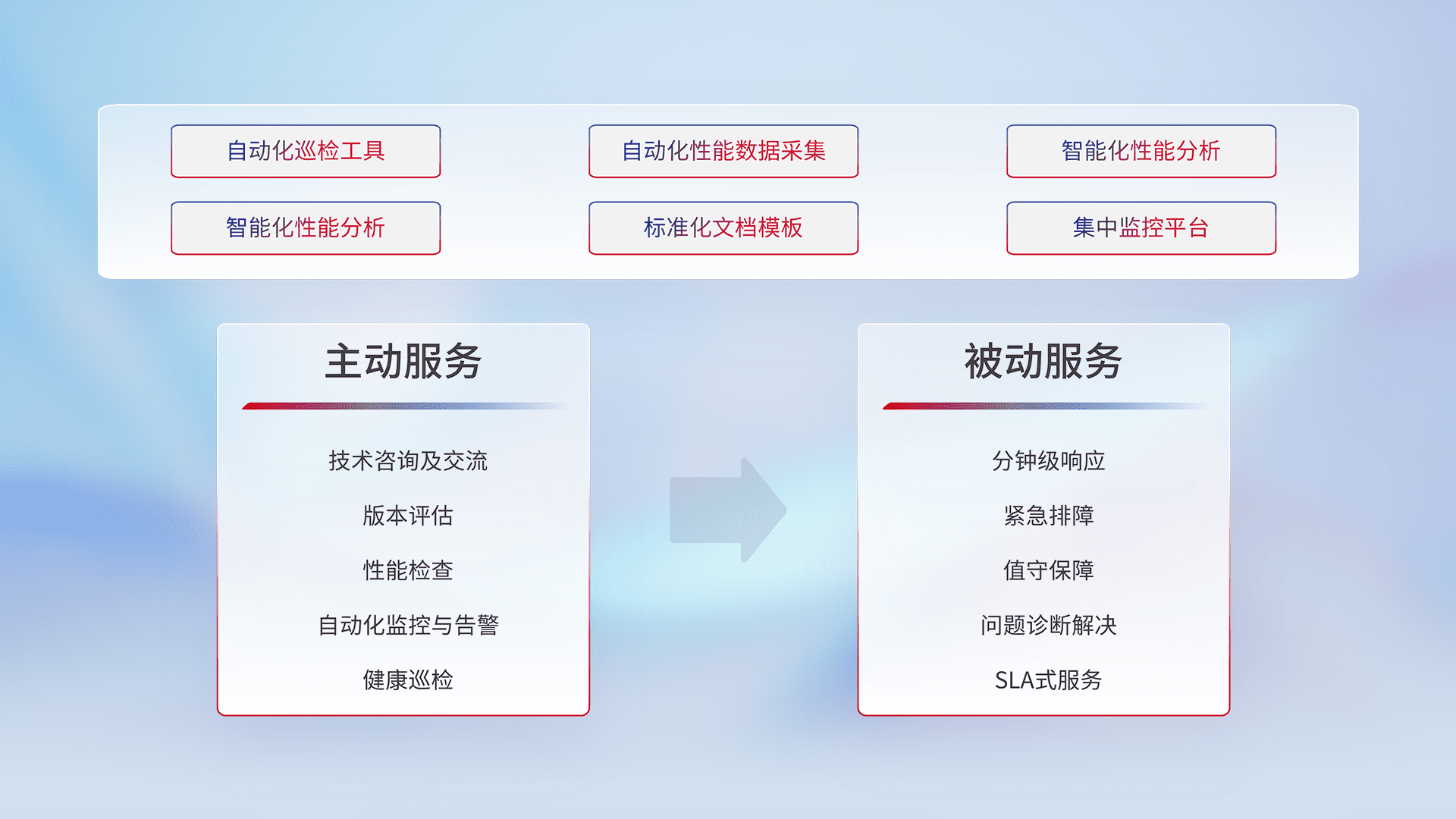 智能化工具和标准化文档,,保障服务质量,,提供主动服务(包含技术咨询、、、、版本评估、、、性能检查、、、、自动化监控与告警、、、健康巡检)和被动服务包含(分钟级响应、、、、紧急排障、、值守保障、、、、问题诊断解决、、SLA服务)。。